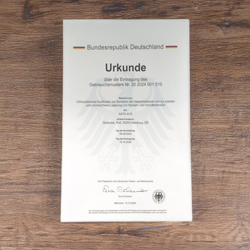 Für das orthopädische Nackenstützkissen zur korrekten, stabilen und schmerzfreien Lagerung von Halswirbelsäule, Nacken und Schulter besteht ein Patent als Gebrauchsmuster beim DPMA.